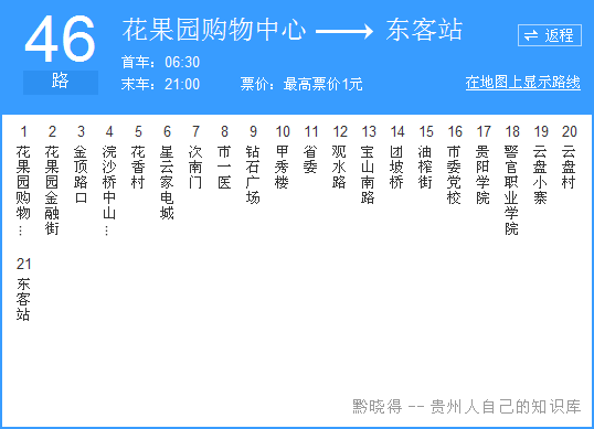 【回向】:客運東站——吉源駕!票P小寨——市委黨校——油榨街——蟠桃宮——寶山北路口——師大——相寶山——鹿沖關公園——大關——楊家莊——甲秀北路——貴陽北站 線路長度:20.91公里。車輛配置:15臺(11.5米LNG空調(diào)車) 公交車的運營時間:6:30-22:00。
