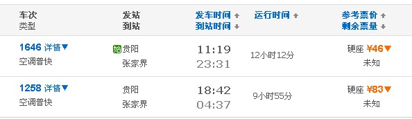 貴陽(yáng)到張家界的列車(chē)有:1646次和1258次空調(diào)普快。