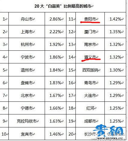 網(wǎng)傳的。全國(guó)20大白富美比例最高城市,貴陽(yáng)榜上有名!